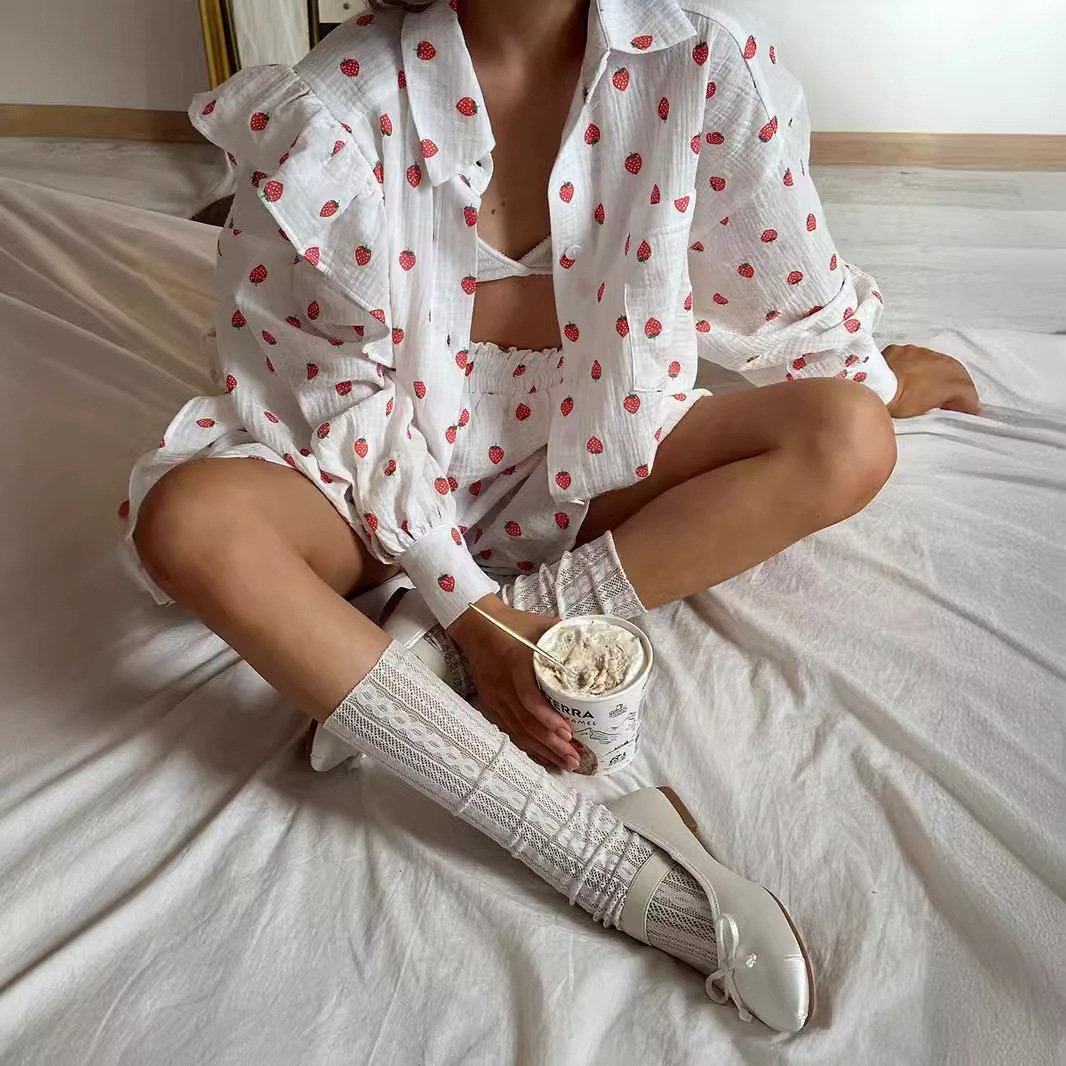 Cotton yarn print suit summer ruffle design love strawberry print shirt shorts suitCotton yarn print suit summer ruffle design love strawberry print shirt shorts suit