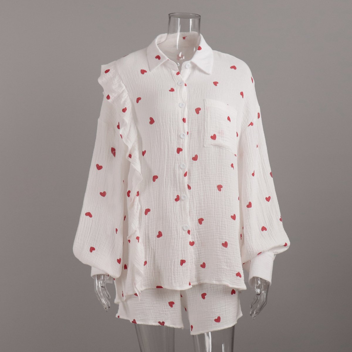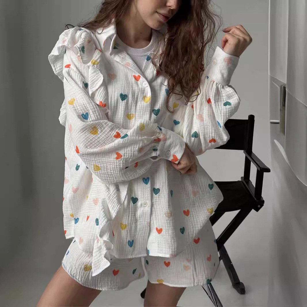 Cotton yarn print suit summer ruffle design love strawberry print shirt shorts suit