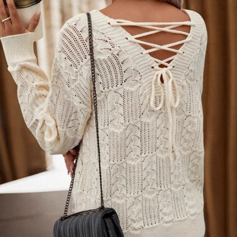 Fashion Women’s Sweater Lace-up Back Hollow Knitted Collar Versatile Tops Factory