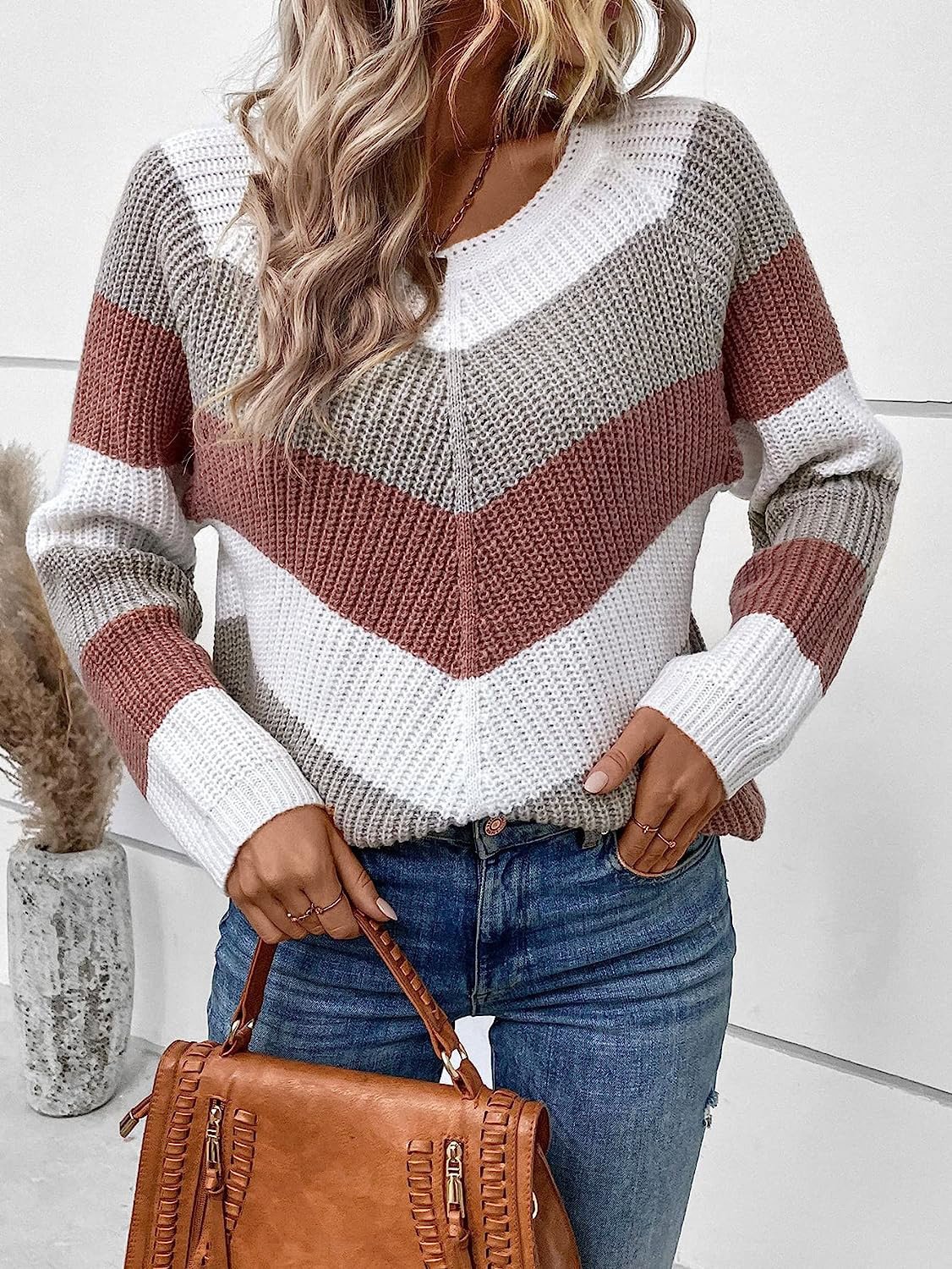 Fashionable round neck striped symmetrical contrast stitching lazy style pullover sweater for women