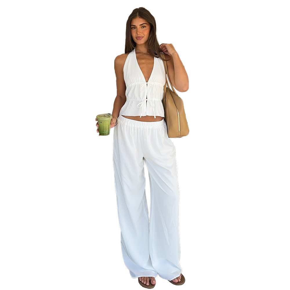 Halter neck vest + trousers two-piece set, strappy vest, wide-leg trousers, pure cotton set