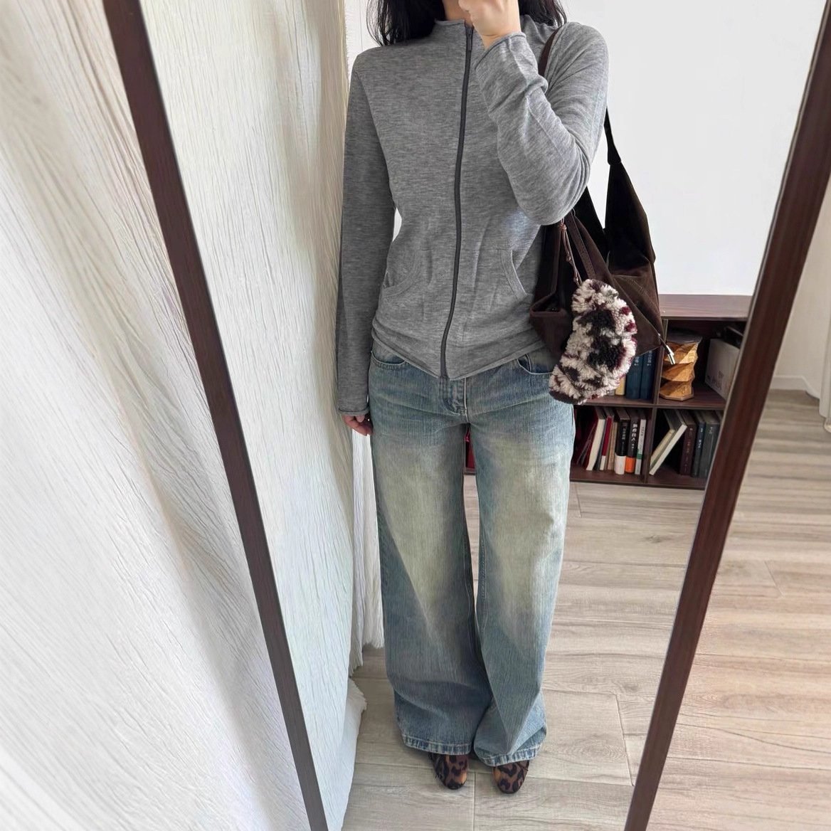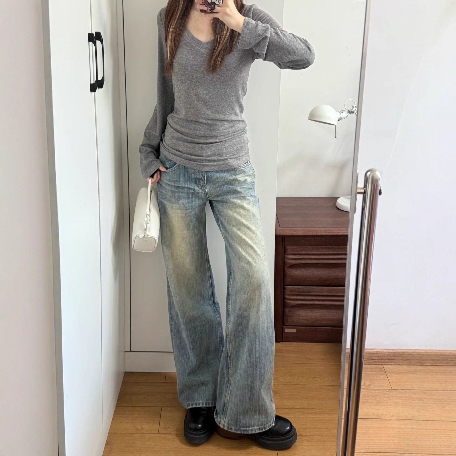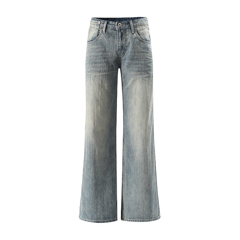 Retro washed blue otaku three-dimensional whiskering pleated mid-low waist denim casual pants for women