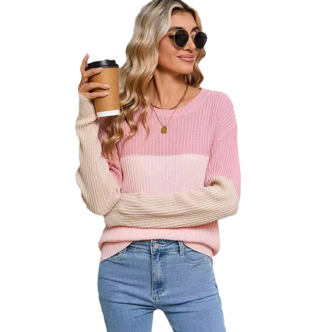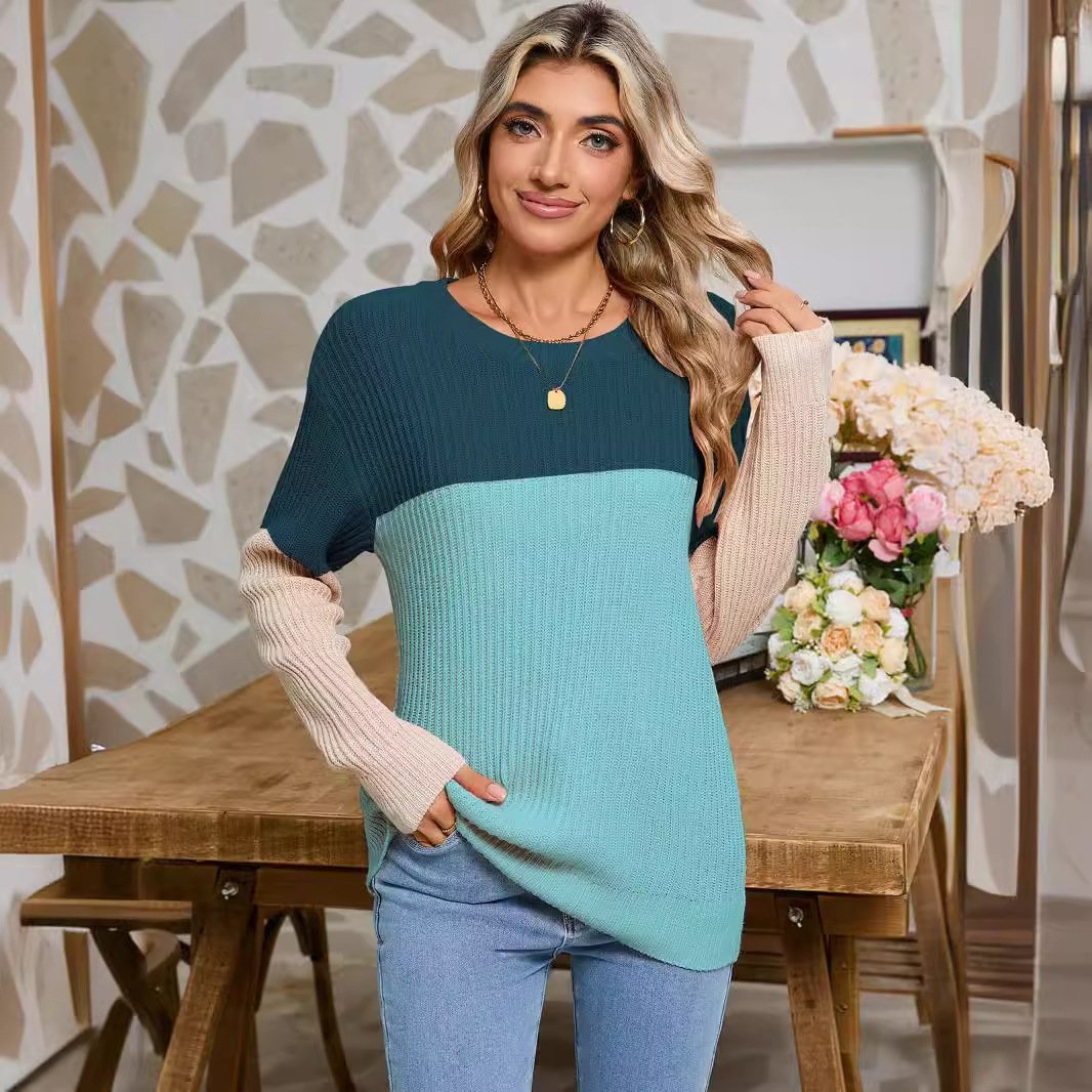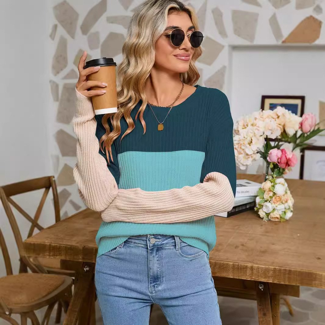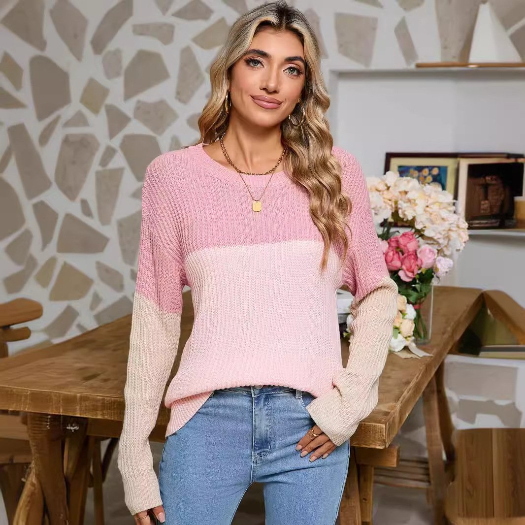 Temperament commuting loose spliced long-sleeved knitted top round neck pullover sweater for women