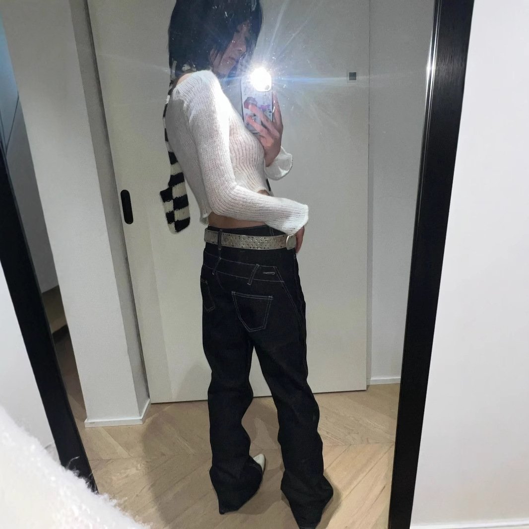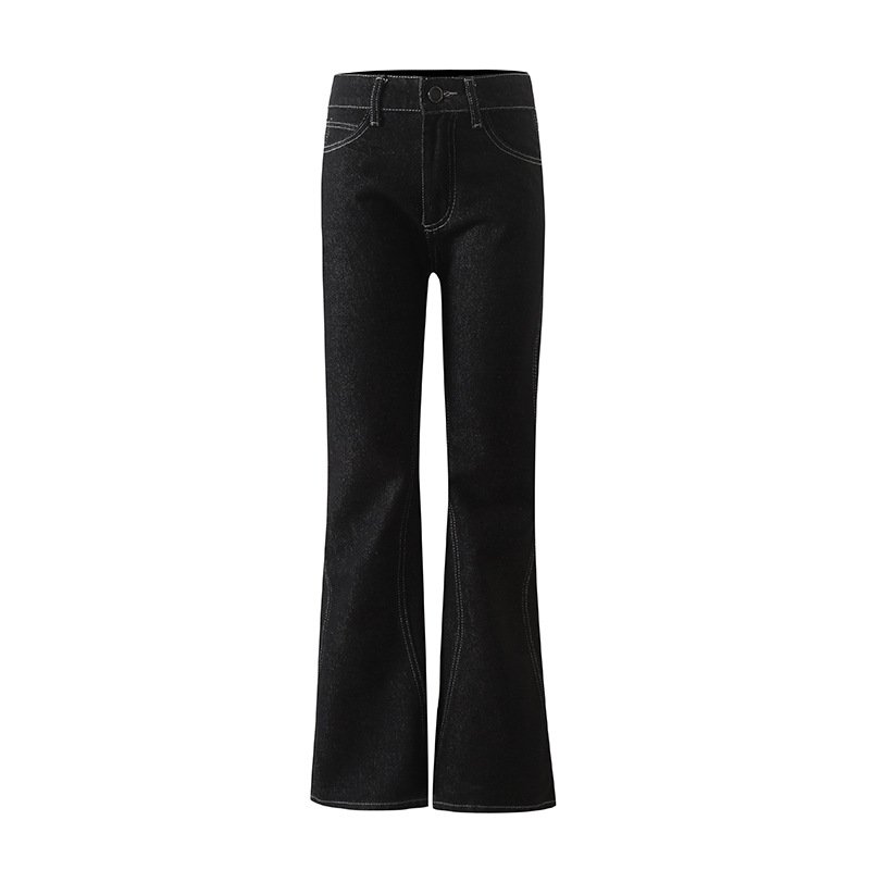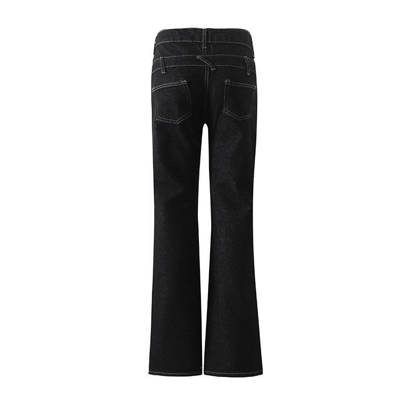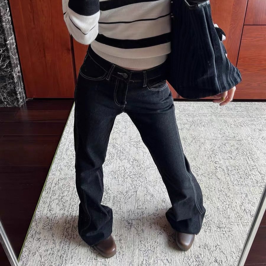 Top-stitched stitching slimming butt lift mid-low waist twisted bone line slightly flared denim trousers for women