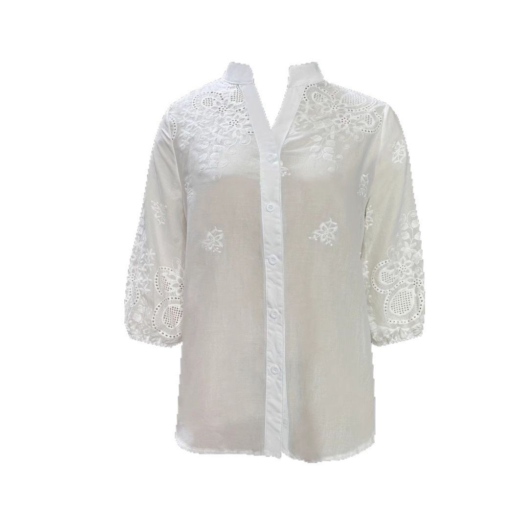 White embroidered shirt for women, three-quarter sleeve shirt, commuting temperament, solid color shirt topWhite embroidered shirt for women, three-quarter sleeve shirt, commuting temperament, solid color shirt top