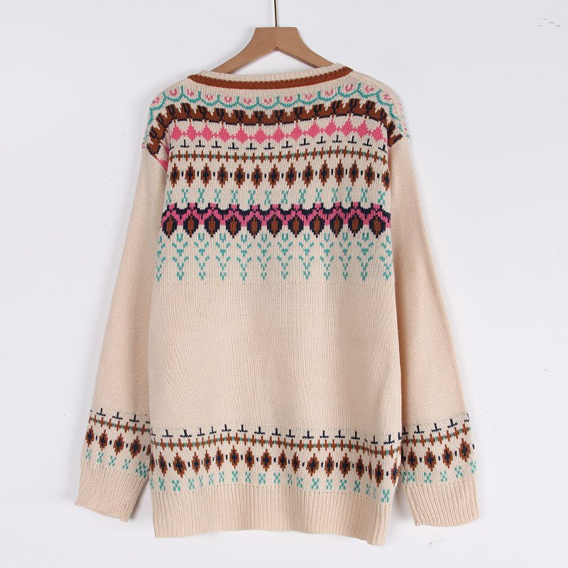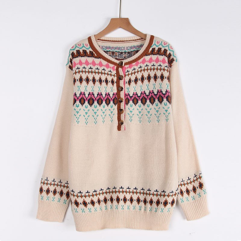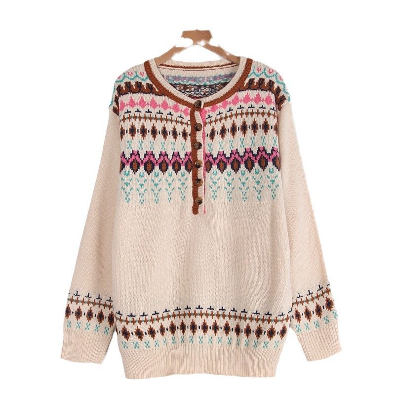 Women’s Long Sleeve Christmas Sweater Women’s Retro Style Jacquard Button Pullover Top