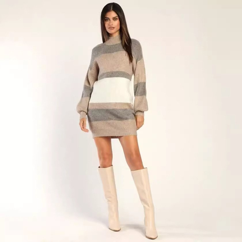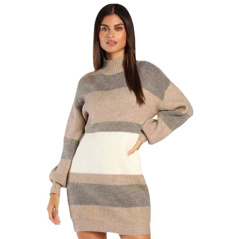 Yangyang Sweater Women’s Sweater Striped Contrast Color Round Neck Pullover Long Sleeve Dress